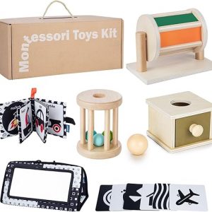 Montessori Toys for Babies 0-6 Months, 6 in 1 Learning Educational Set for Newborn, Toddlers Gifts Includes Spinning Drum, Object Permanence Box, Baby Roller Tummy Time Mirror and More